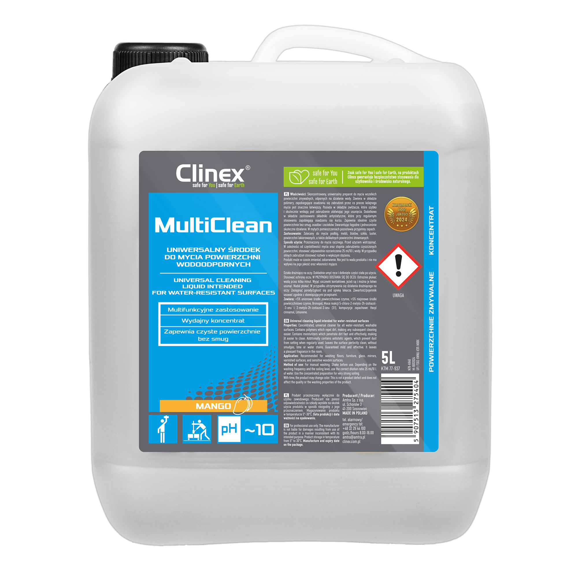 Clinex Multi Clean – це концентрована універсальна рідина для очищення водостійких поверхонь, що можна мити. Формула засобу збагачена полімерами, які запобігають відкладенню бруду, що значно полегшує подальше миття. Концентрат збагачений полімерною формулою, що запобігає осіданню бруду, полегшуючи наступні очищення. Змочувальні агенти швидко проникають під забруднення, спрощуючи його видалення, а антистатичні компоненти зменшують осідання пилу при регулярному використанні. Засіб забезпечує ідеальну чистоту поверхонь без розводів, нальотів і плям, залишаючи в приміщеннях приємний аромат.